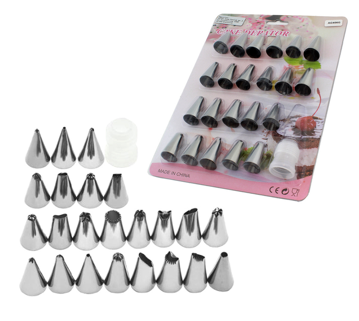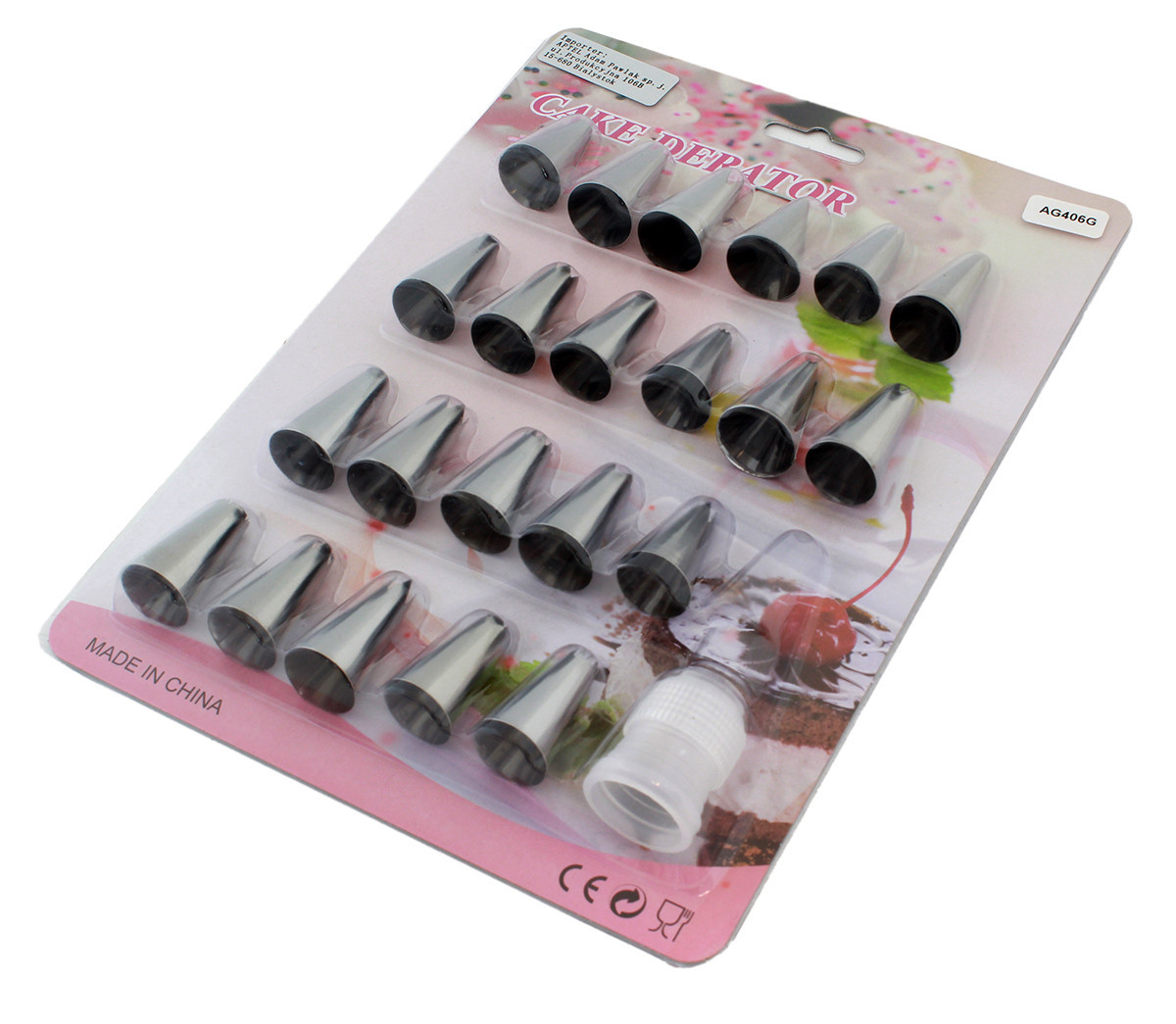 Отличный набор, состоящий из 23 разных стальных наконечника. С их помощью можно красиво украсить торты, пироги и тарелки, на которых ты подаешь блюда! Их можно безопасно мыть в посудомоечной машине и использовать с пищевыми продуктами!