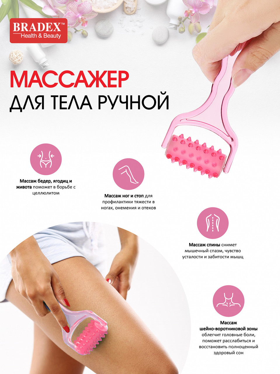 Роликовый массажер прост в применении. Он снабжен удобной, прочной пластиковой ручкой, которая делает процедуру максимально комфортной. Возрастных ограничений по использованию изделия нет.