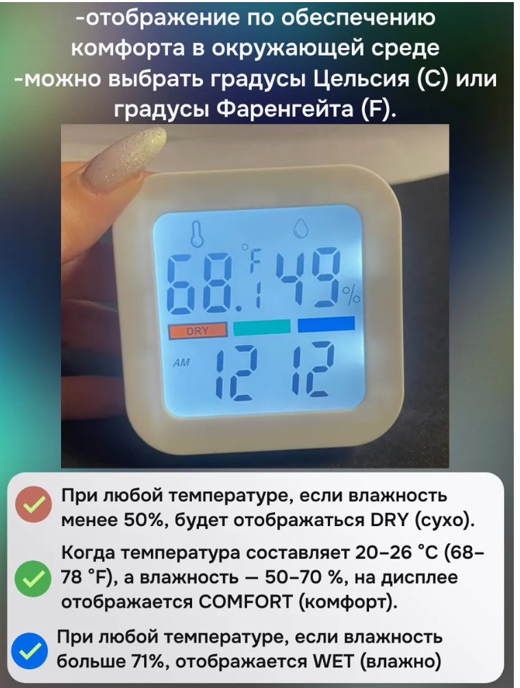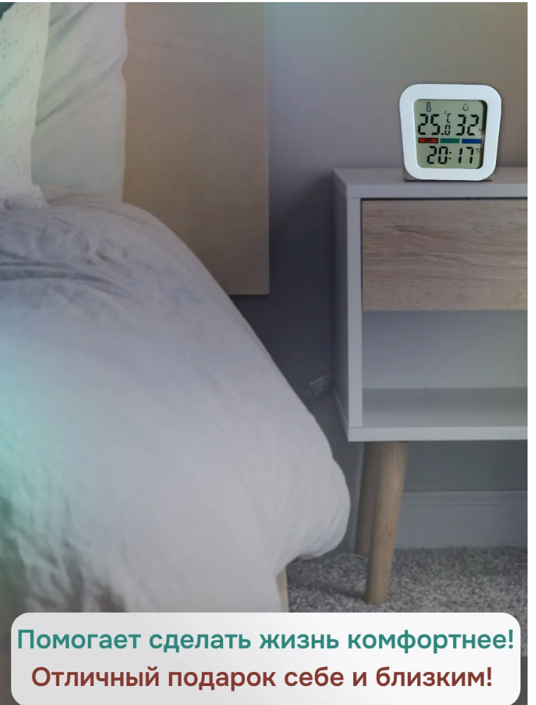 Гигрометр термометр с часами помогает сделать жизнь комфортнее. Температура и влажность в помещении непосредственно влияют на наше здоровье, а резкие перепады могут привести к сухости в горле, аллергии и просто неприятным ощущениям.