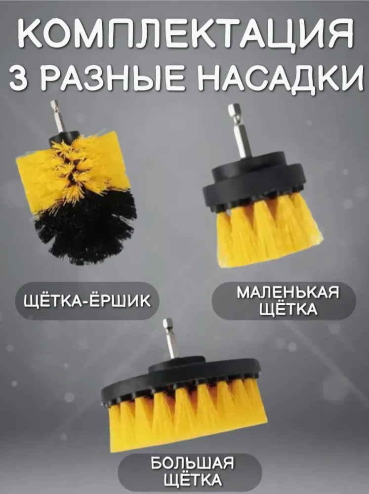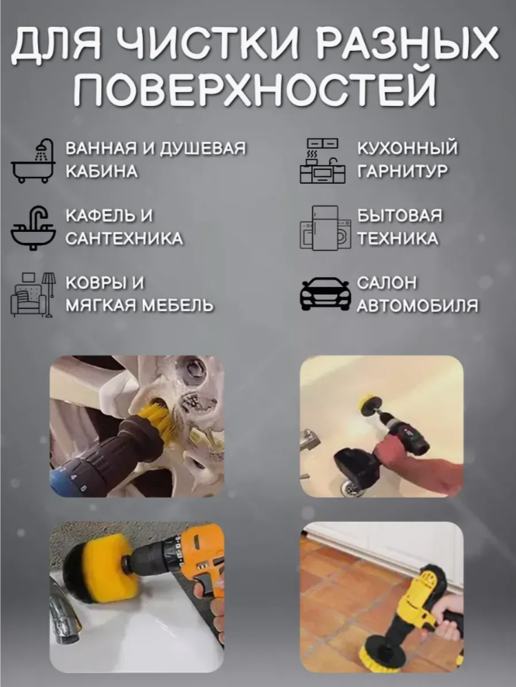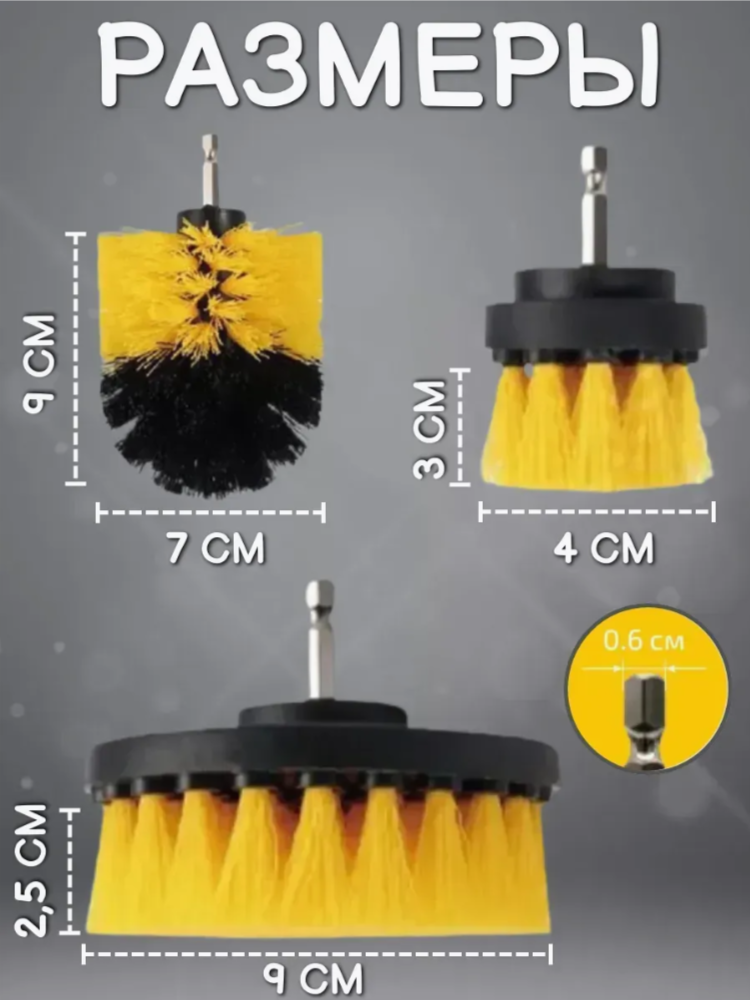 Предназначены для очистки различных поверхностей с помощью дрели шуруповерта. Идеально подходит для чистки различных поверхностей плитки, пола, сантехнической арматуры, ковров ,автомобильных обшивок и многого другого. Отлично подходит для химчистки салона.