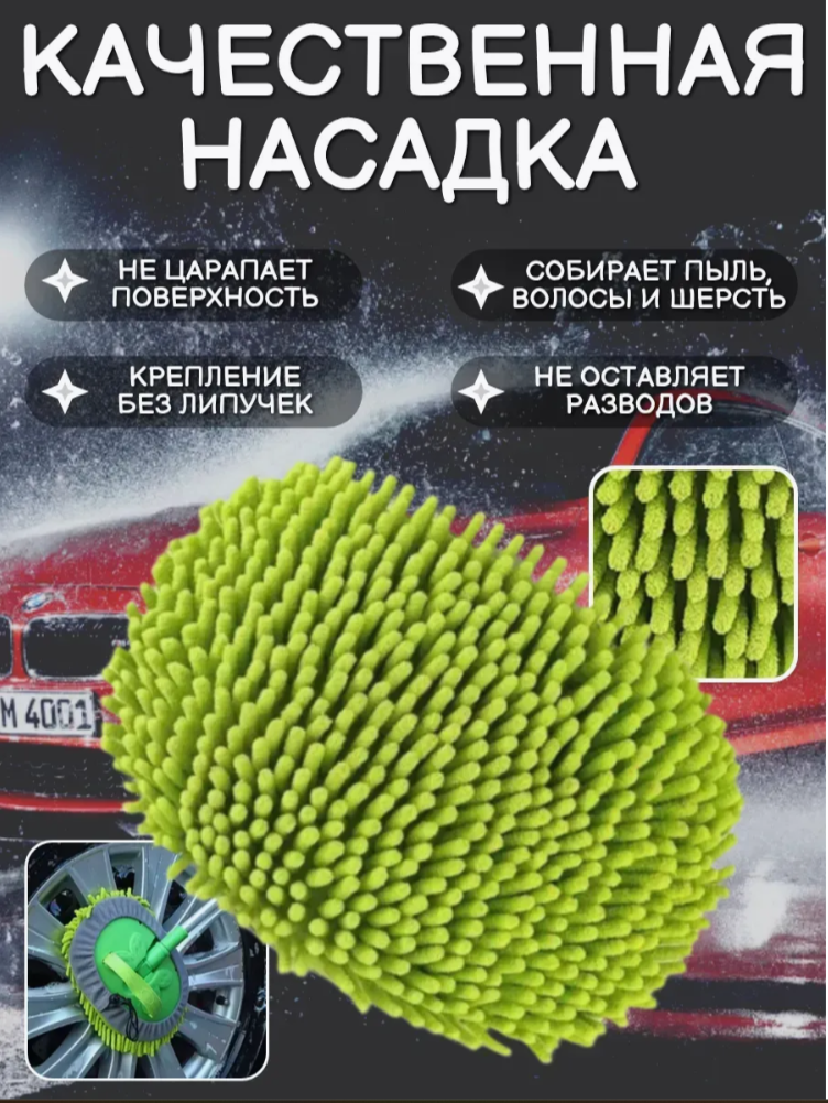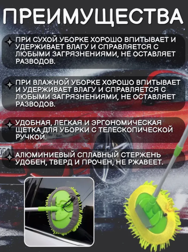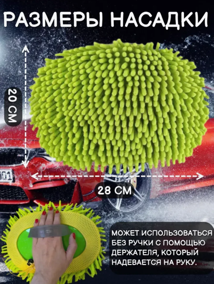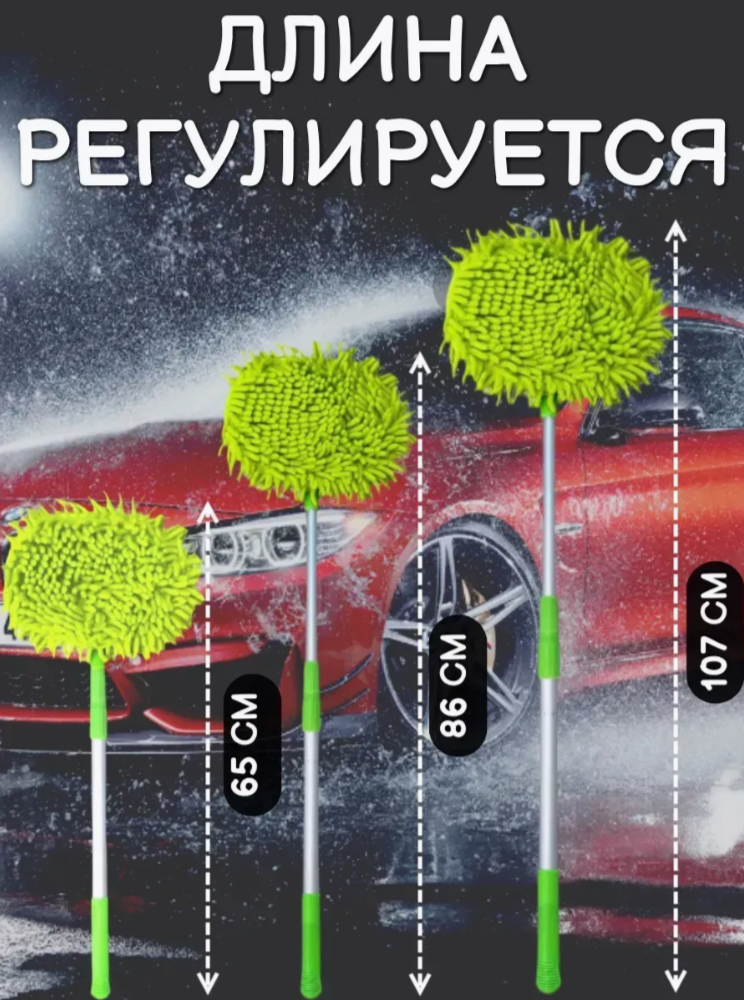 Щетка для автомобиля телескопическая регулируется на 3 длины (128,5 см, 94 см, 59 см) с фиксацией. Щетка для мойки автомобиля может использоваться без ручки с помощью держателя, который надевается на руку.